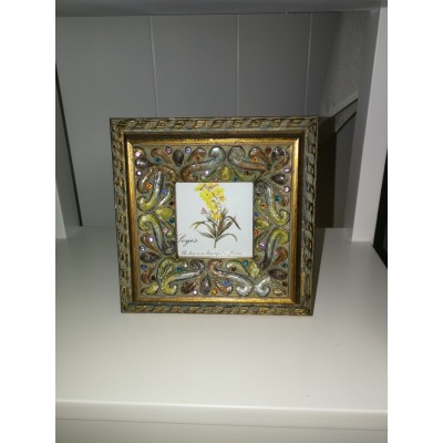 Cadre photo en bois patiné doré et couleurs Très beau cadre photo en bois, il est en patine doré et orné d'incrustations de couleurs et nacrées Très lumineux H 16 x l 16 (cadre) H 7.5 x l 7.5 (photo) Très bon état.