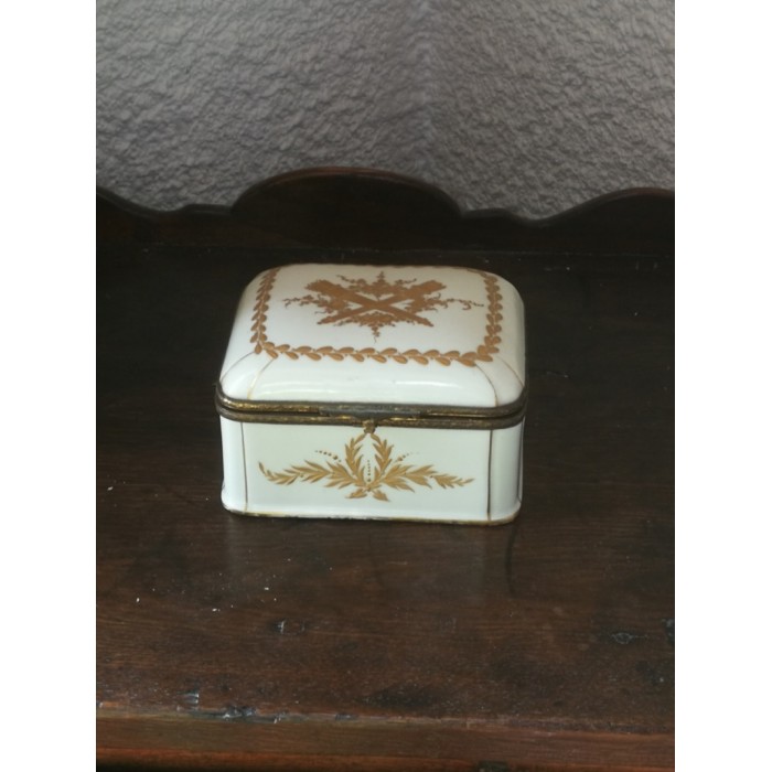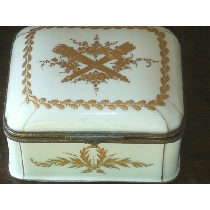 Boîte couverte en porcelaine à décor en rehaut doré de carquois et de guirlandes