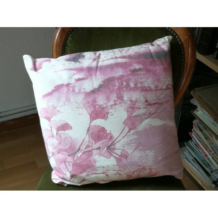 En tissu rose et blanc avec un décor de motifs floraux sur le devant et uni écru sur le derrière