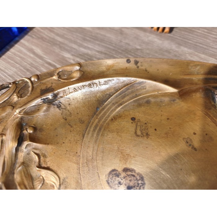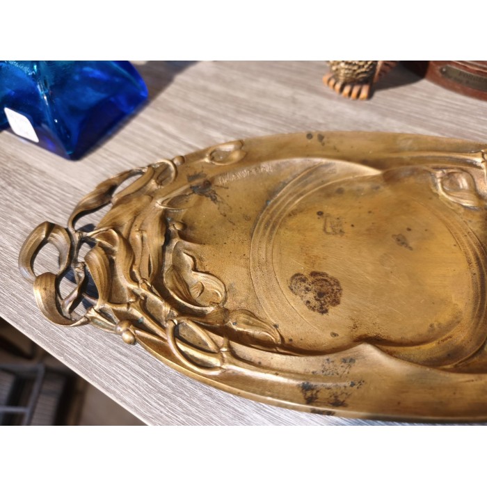 Plateau Vide poche en Bronze doré signé a. laurent à décor de gui qui se répète de chaque côté afin de former les anses Art déco
