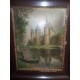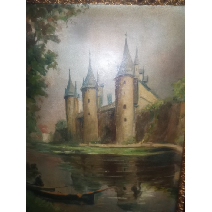 Cette peinture représente une vue en perspective d'un paysage d'un château au bord d'un lac