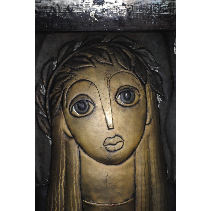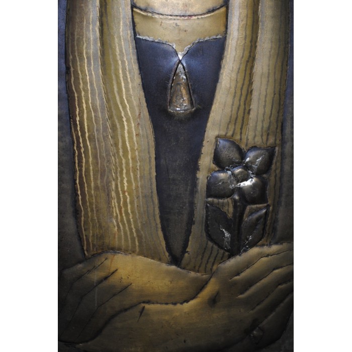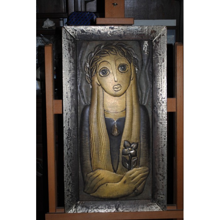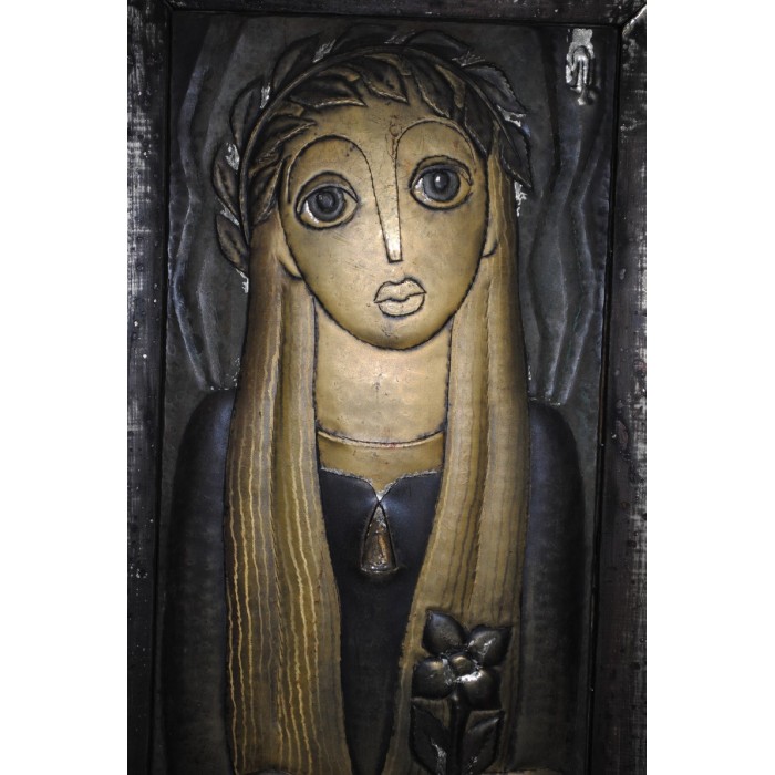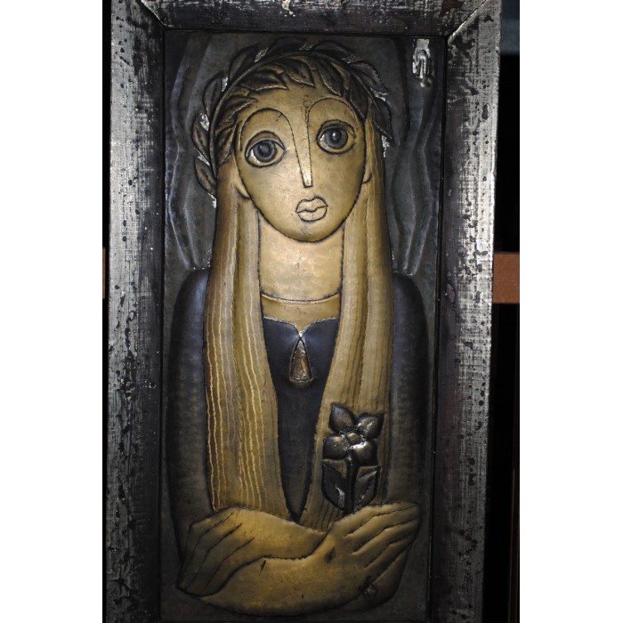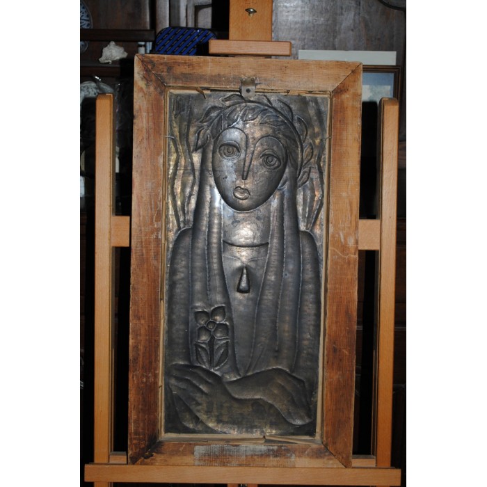 Sculpture sur Cuivre estampé Jeune Vierge signée en HAUT à droite dans un encadrement en bois