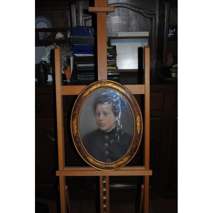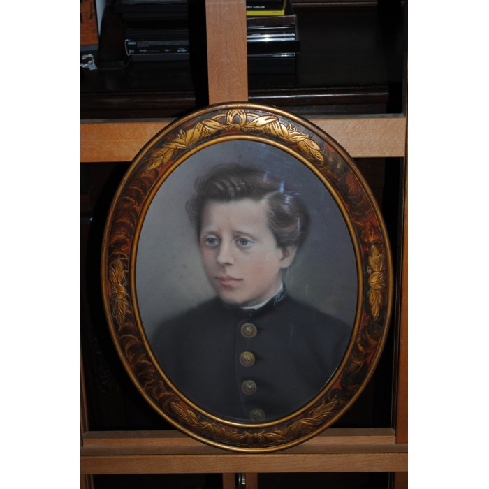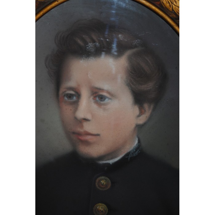 Dessin au Pastel Portrait Buste d'un jeune Officier garçon militaire XIXème Siècle encadré dans un cadre ovale ancien