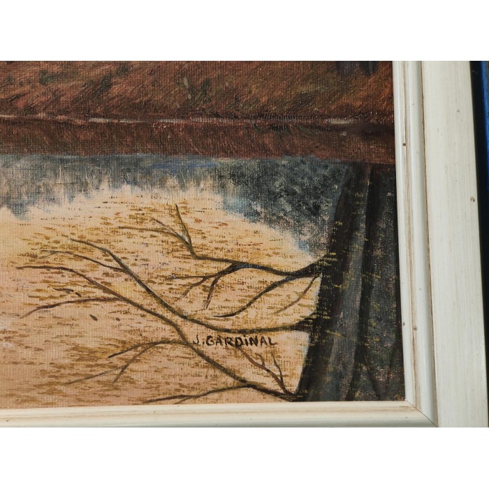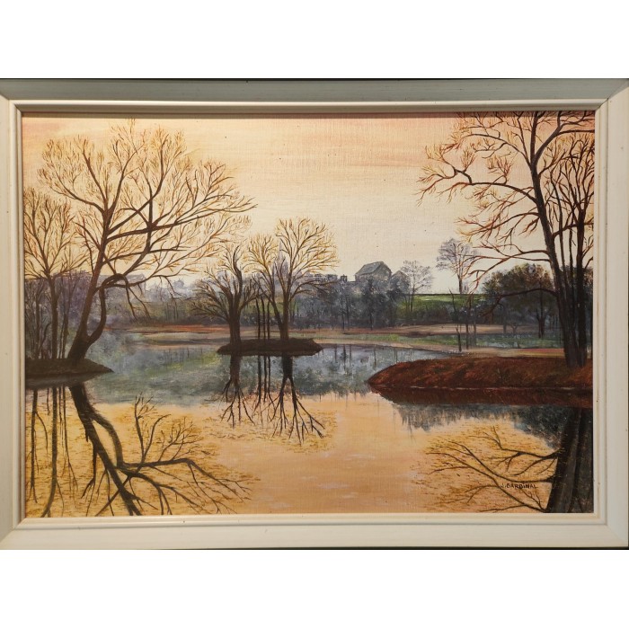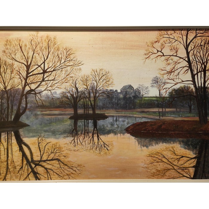 HUILE sur toile par jeanine Gardinal Titrée A l'Aube Paysage à l'étang en bordure de Village