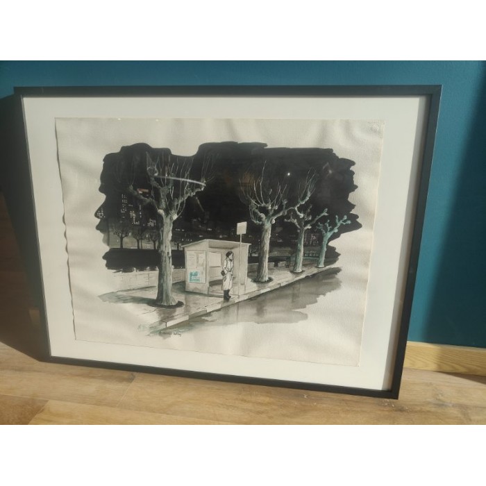 Lavis encre de chine Le dernier Trolley à Tarare dans le Rhône par michel Farine peintre rare